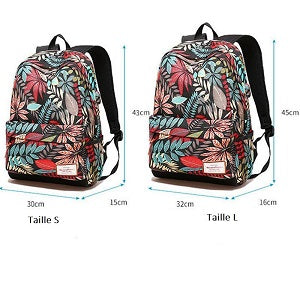 sac à dos en toile polyester - motif floral - plusieurs tailles - courroie d'épaule arquée - plusieurs rangements - fermetures éclairs dissimulée par un rabat en toile